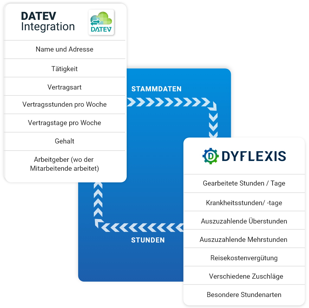 Die Integration von Dyflexis und DATEV gewährleistet einen reibungslosen Übergang von der Dienstplanung und Zeiterfassung zur Lohnabrechnung.