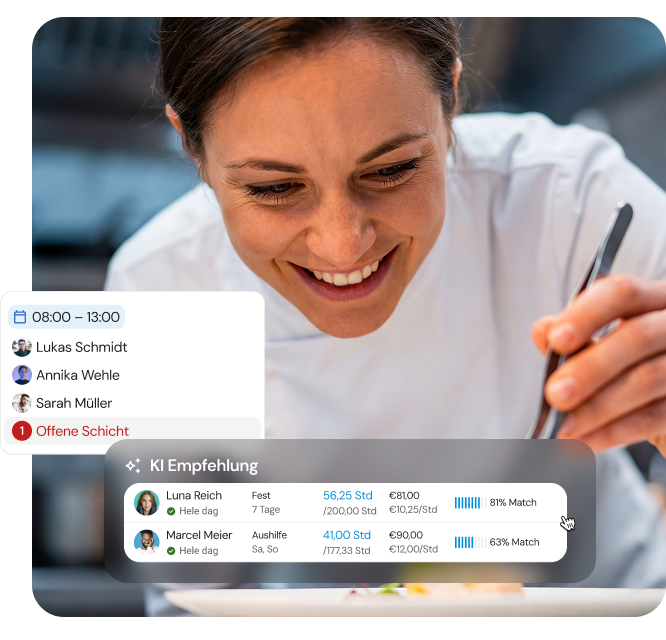 Was früher Stunden kostete, erledigen Sie jetzt mit wenigen Klicks. Selbst komplexe 4- oder 5-Schichtmodelle bilden Sie in Minuten ab. Ändert sich die Auftragslage, passen Sie Ihren Personalbedarf ebenso schnell an. Ohne Excel-Chaos, ohne Zeitverlust. Der Vorteil: Sie sparen bis zu 9 Stunden pro Woche bei der Dienstplanung.