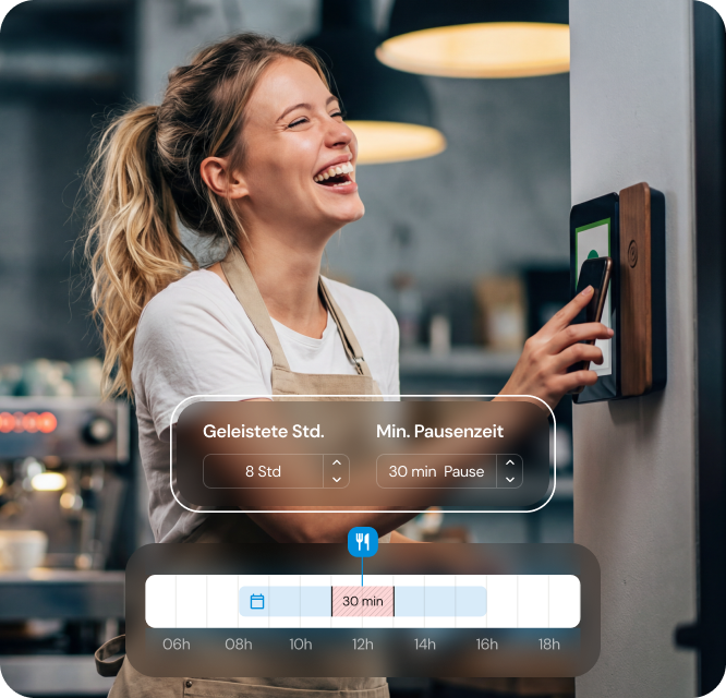 Unsere digitale Stempeluhr denkt mit. Pausen und Zuschläge werden exakt nach Ihren Vorgaben verarbeitet. Das bedeutet für Sie: