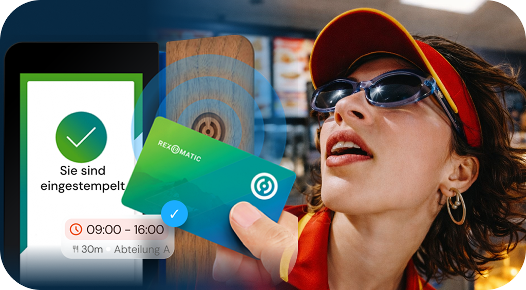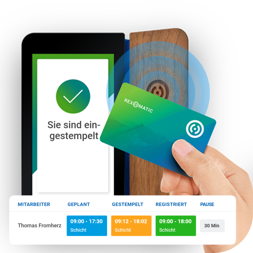 Mit der Rex-O-Matic NOA stempeln Mitarbeitende sich ganz einfach und bequem ein oder aus, zum Beispiel mit dem Mitarbeiterausweis. Arbeitszeiten werden automatisch erfasst und dokumentiert. 100 % DSGVO-konform.