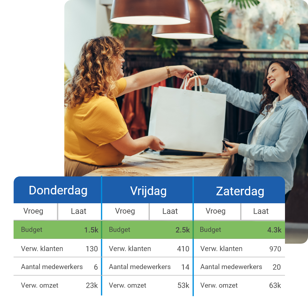Iedere kledingwinkel kent zijn eigen dynamiek, met elk andere piekmomenten. Met behulp van data wordt er proactief gestuurd op bijvoorbeeld loonkosten, omzet en verwachte drukte. Deze data zorgt ervoor dat er automatisch een perfecte planning voor je gemaakt wordt met een optimale personeelsbezetting waardoor je nooit te weinig, of te veel, medewerkers op de vloer hebt staan.