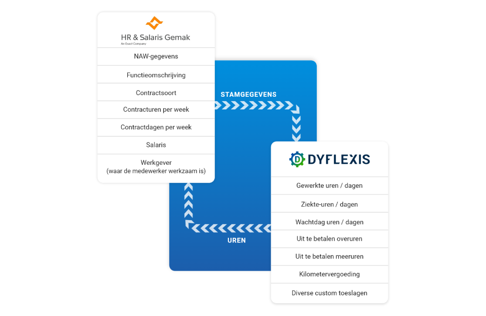De koppeling tussenHR & Salarisgemak en Dyflexis is gemaakt voor het uitwisselen van twee soorten data: Persoonsgegevens en periodieke mutaties (uren en dagen). Hiervoor heeft HR & Salarisgemak het programma HR & Salaris Gemak ontwikkeld. Binnen HR & Salaris Gemak worden de persoonlijke gegevens van medewerkers zoals, het type contract en salaris direct geregistreerd. Deze gegevens worden in real-time doorgevoerd in Dyflexis. Voor de salarisverwerking worden de uren automatisch aangeboden aan HR & Salaris Gemak zodat de medewerker het juiste salaris ontvangt op basis van de gewerkte uren.