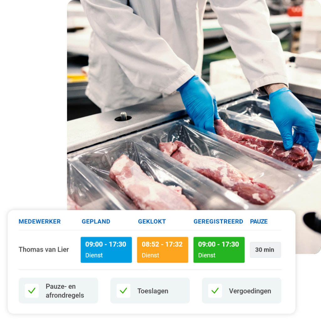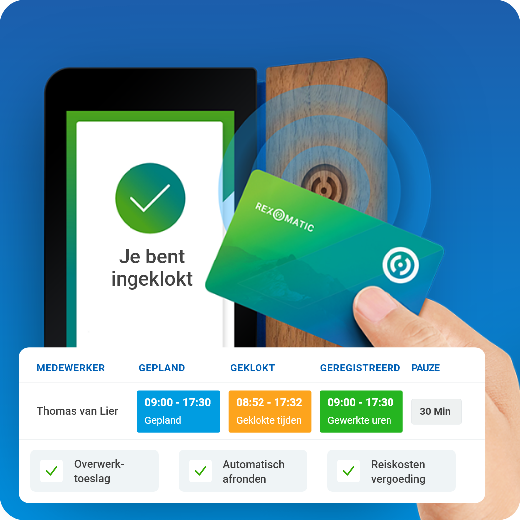 Medewerkers klokken eenvoudig in en uit door het scannen van een persoonlijke pas, tag of hun telefoon. Alleen nog de kloktijden goedkeuren en de werktijtden zijn vastgelegd, inclusief pauzes, afrondingen en toeslagen. Zo heb je altijd een kloppende urenregistratie. Zo bespaar je tijd en voorkom je fouten.